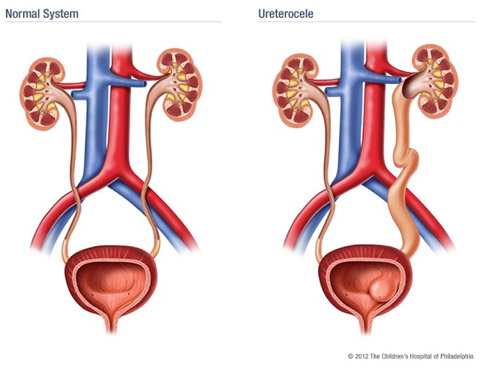 Ureterocele é o abaulamento da porção final do ureter (desenho). Ocorre mais comumente em meninas e em 10% dos casos são bilaterais. Muitas vezes estão associados a outras anormalidades anatômicas do aparelho urinário, as mais comuns são a duplicidade do sistema coletor do polo superior do rim, e o orifício de drenagem do ureter fora da bexiga (ureter ectópico).